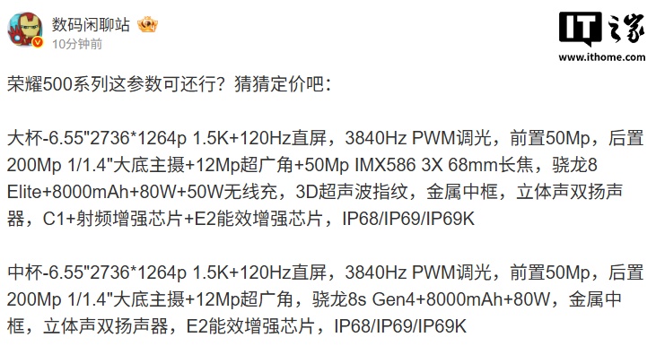 alixixi 11 月 17 日消息,今日早些时候,荣耀 500 系列新品发布会官宣定档 11 月 24 日 19:30,代言人为肖战。博主 @数码闲聊站 现已曝光两款新机的主要参数。