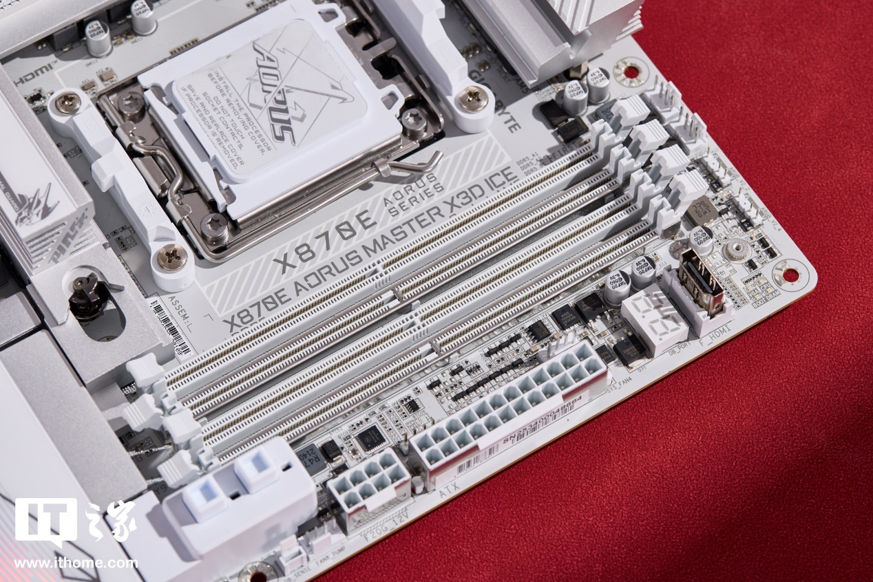 技嘉 X870E X3D 超级冰雕主板作为消费级高端定位的旗舰主板,通体全部做了白色处理,包括 PCB、散热装甲、插槽、接口和按钮等,不仅在视觉上呈现出高度一体性和高级质感,也是白色系装机中的绝佳搭档。