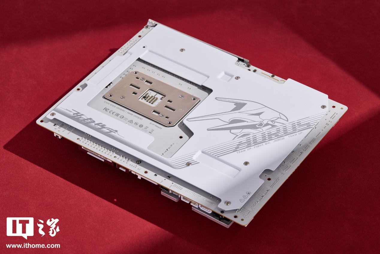 主板背部覆盖大面积白色一体式背板,能够保护主板和增加散热能力,需要注意的是下半部分采用实心设计,部分机箱在安装主板时需要先拧下个别承重螺柱才能兼容。