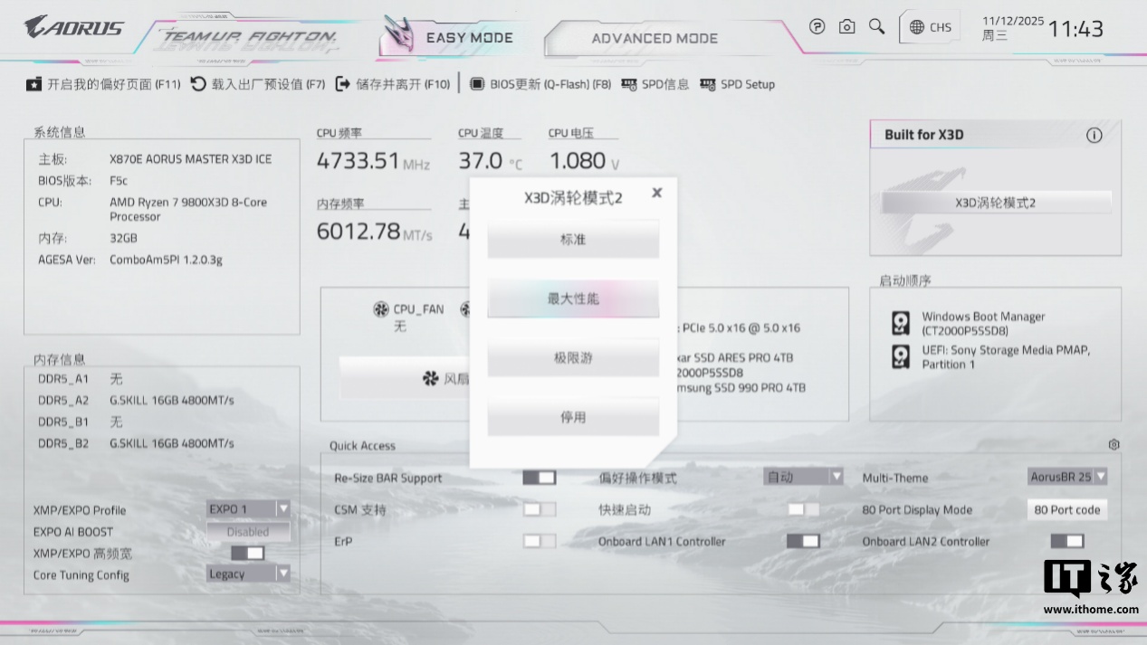 技嘉 X870E X3D 超级冰雕主板给我印象最深刻的,并非是最极致的 CPU 和内存性能表现,而是其软硬件设计上的「便利性最大化」,无论是主板上散热装甲、PCIe 显卡插槽,M.2 插槽、无线 Wi-Fi 天线等各处的快易拆设计,预装 Wi-Fi 驱动、自动下载 GCC、OnFly X3D 等软件,还是 AI SNATCH 内存超频和 X3D 鸡血模式 2.0 启用、切换起来的简单粗暴,都让我感到非常贴心和实用,即使是小白用户也不需要很高学习成本,装机和性能调试都极为简单、方便。