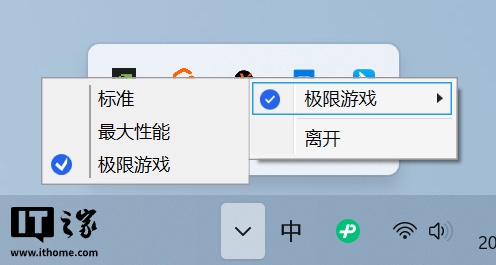 除此之外,装机后首次进入系统,会自动安装 1 个 OnFly X3D 的后台应用程序,用户也可以通过它在状态栏中进行快速切换,虽然操作更加便捷,但并不支持热切换,切换选项后依旧得重启系统才能生效。