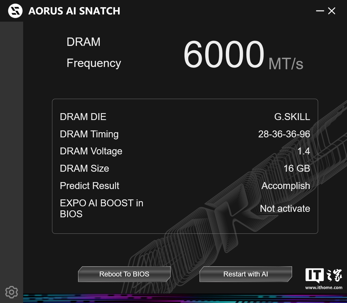 另外,技嘉也支持通过 AORUS AI SNATCH 超频工具进行一键识别内存信息和超频,超频后系统会自动重启并进入 BIOS,选择相应的超频预设即可自动优化 CPU 和内存相关参数,达到最佳的超频效果。