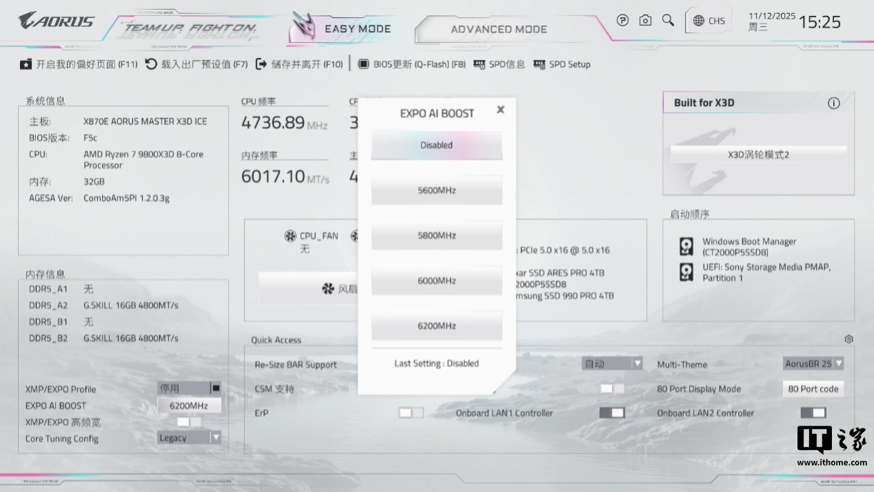重启后进入 BIOS 可以看到,AORUS AI SNATCH 超频工具给到的最高档位超频预设为 6200MHz,选择后 XMP/EXPO 超频选项和高频宽选项会自动停用和禁止开启。
