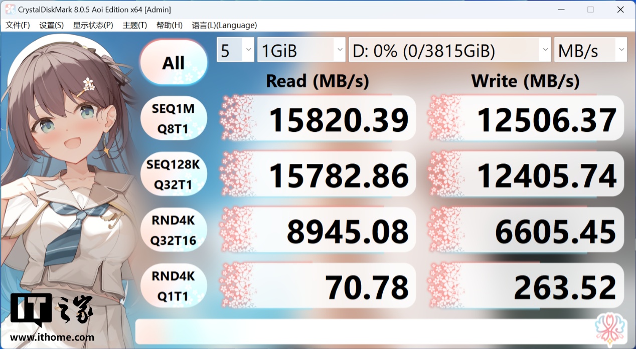 至于硬盘方面,技嘉 X870E X3D 超级冰雕主板提供了 2 个 PCIe5.0x4 的 M.2 固态插槽,alixixi在最上面一条拥有独立散热装甲的主 M.2 固态插槽中插入 1 根 PCIe Gen5 规格的旗舰固态硬盘,官方宣称其支持最大 14000MB/s 的读取速度,经过实测,硬盘的顺序读取速度甚至超过了标称规格,达到 15820MB/s,写入速度也有 12500MB/s 的满速水平,完全可以发挥出这块硬盘的应有实力。