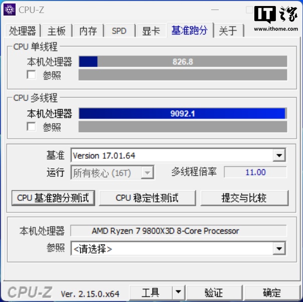 锐龙 7 9800X3D 在「标准」模式下单线程得分 826 分,多线程得分 9092 分;