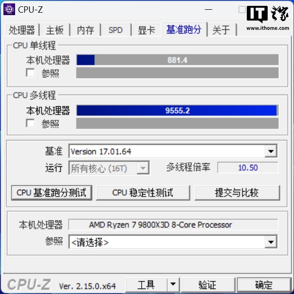 锐龙 7 9800X3D 在「最大性能」模式下单线程得分 881 分,多线程得分 9255 分。