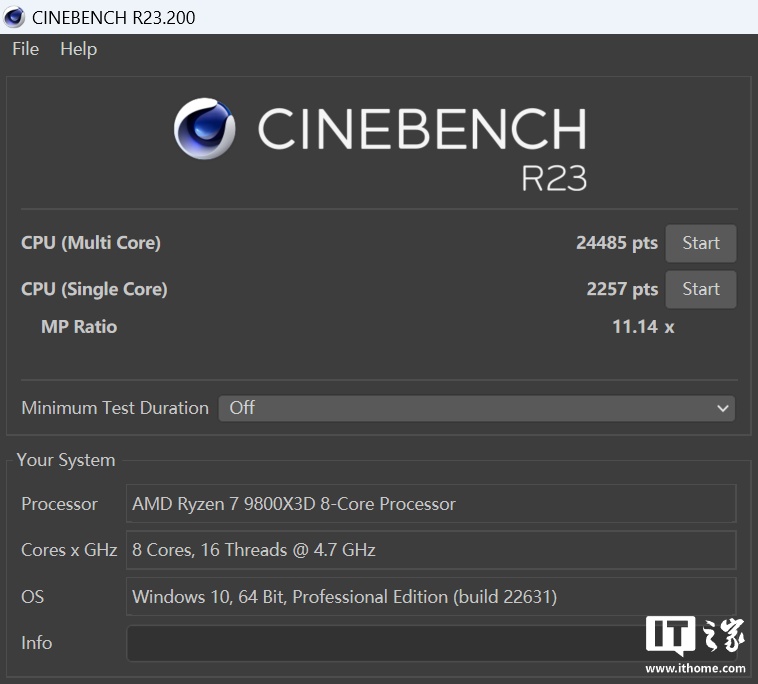 锐龙 7 9800X3D 在「最大性能」模式下单线程得分 2257 分,多线程得分 24485 分。