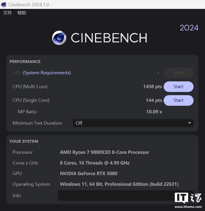 锐龙 7 9800X3D 在「最大性能」模式下单线程得分 144 分,多线程得分 1458 分。
