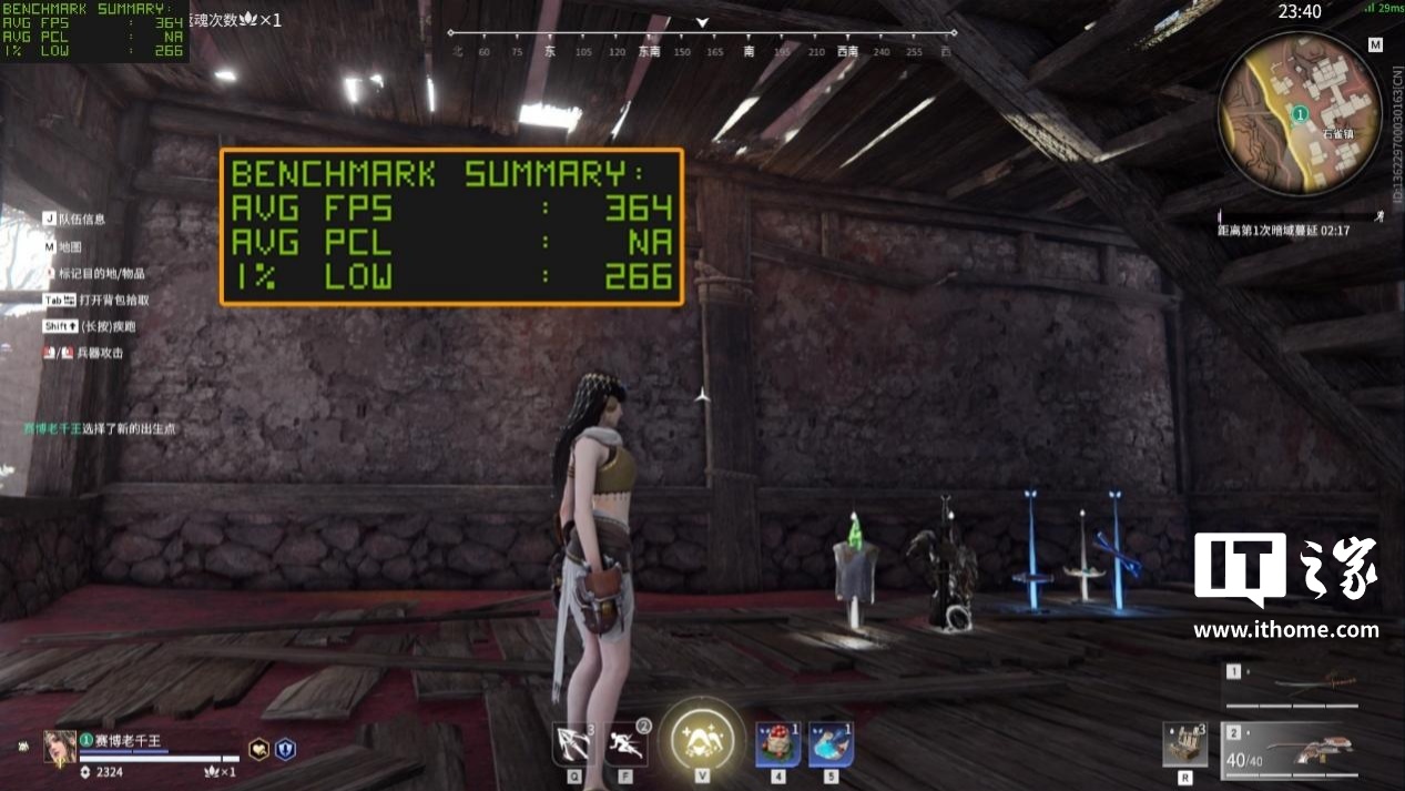 锐龙 7 9800X3D 在「极限游戏」模式下游戏平均帧数为 364 帧,1% Low 为 266 帧;