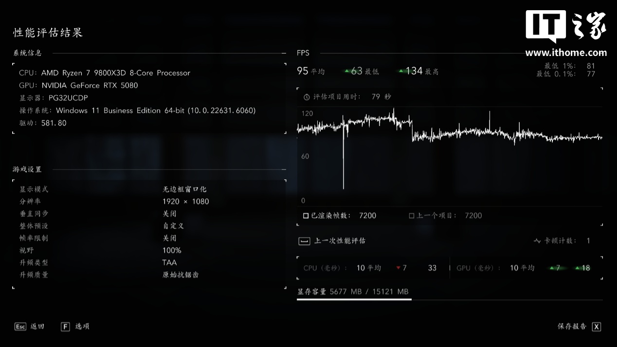 锐龙 7 9800X3D 在「极限游戏」模式下游戏平均帧数为 95 帧,1% Low 为 81 帧;