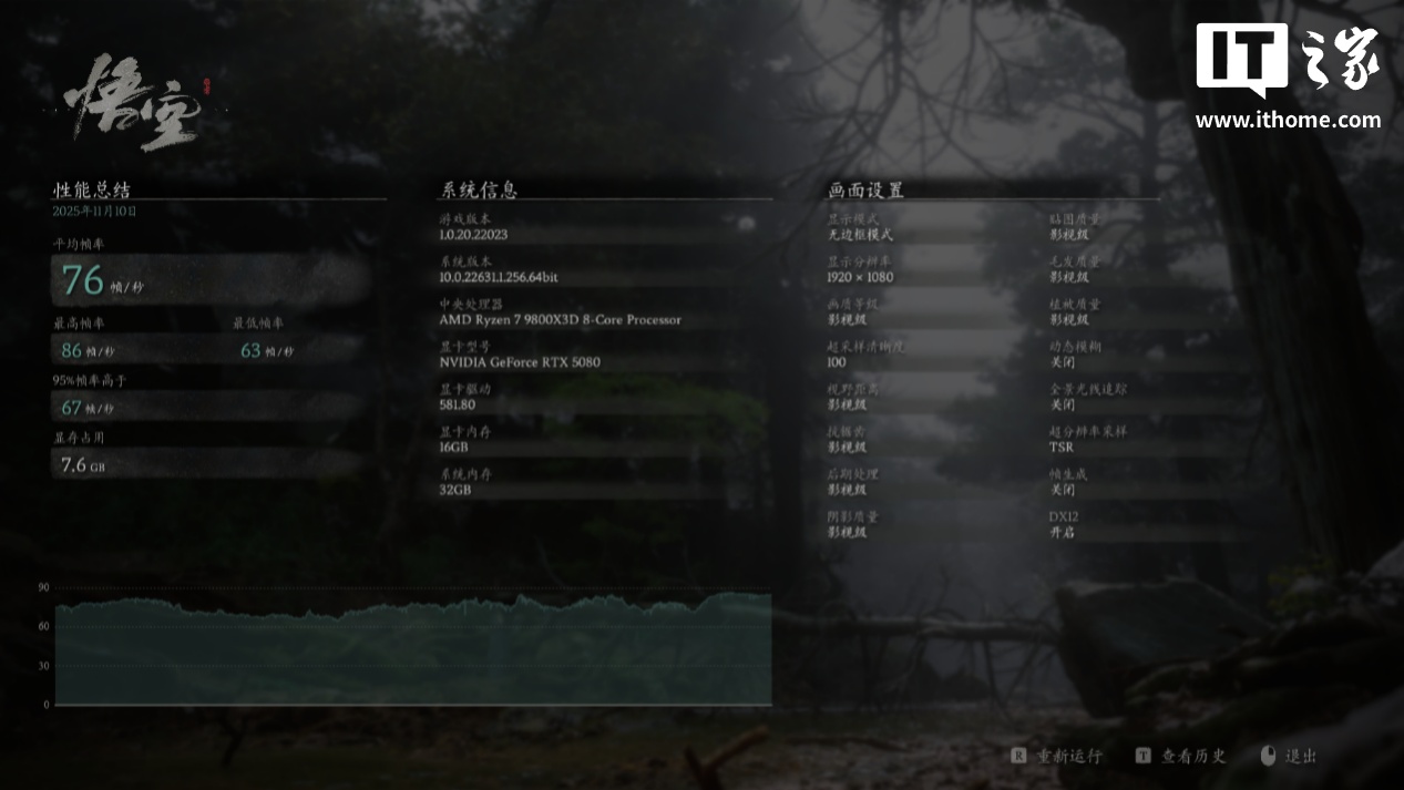 锐龙 7 9800X3D 在「极限游戏」模式下游戏平均帧数为 76 帧,1% Low 为 64 帧;