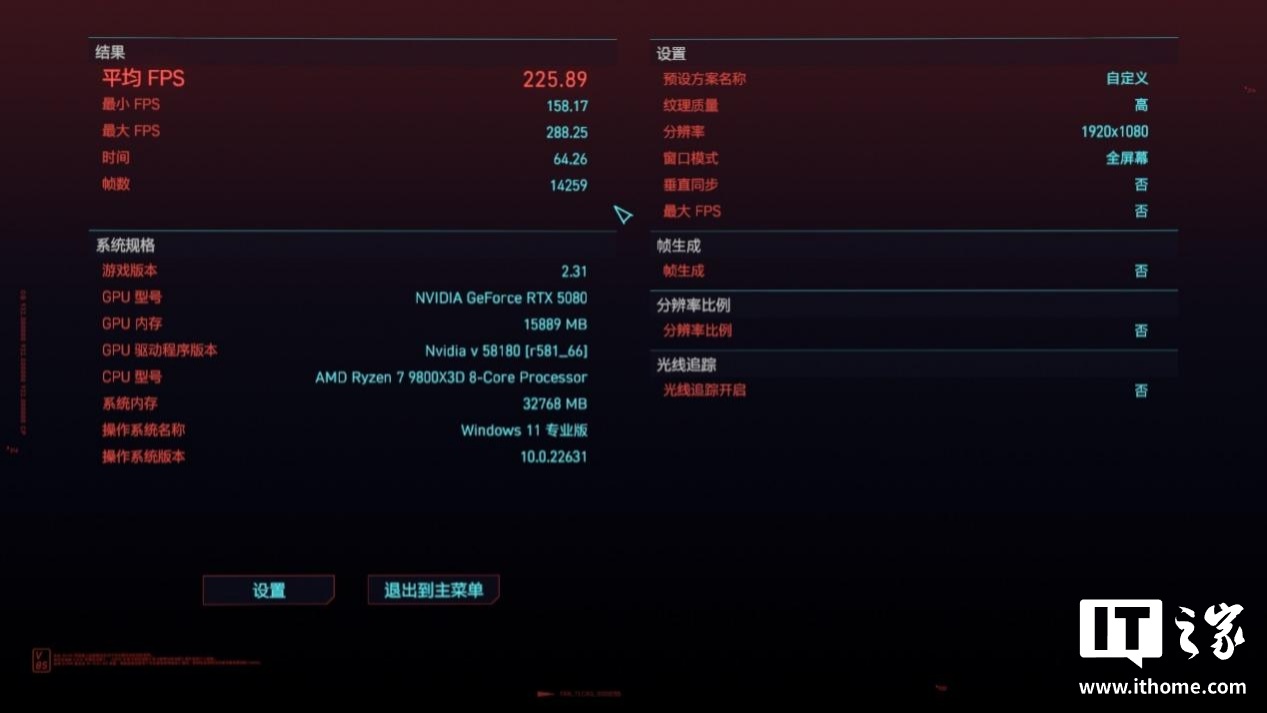 第六款游戏是《赛博朋克:2077》,以 1080P 分辨率 + 超级画质预设,运行游戏自带基准测试: