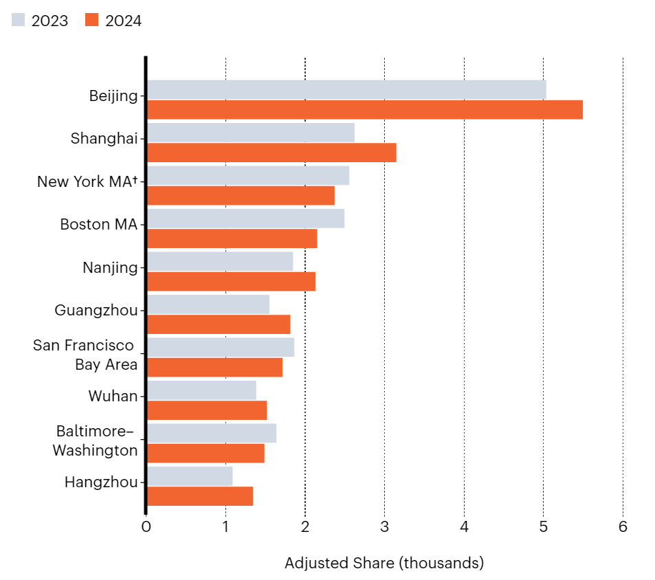 根据自然指数的关键指标“贡献份额”,北京在 2023 年至 2024 年间科研产出增幅逾 9%,上海增幅近 20%,而同期全球十强中所有美国城市的份额均有所下滑。