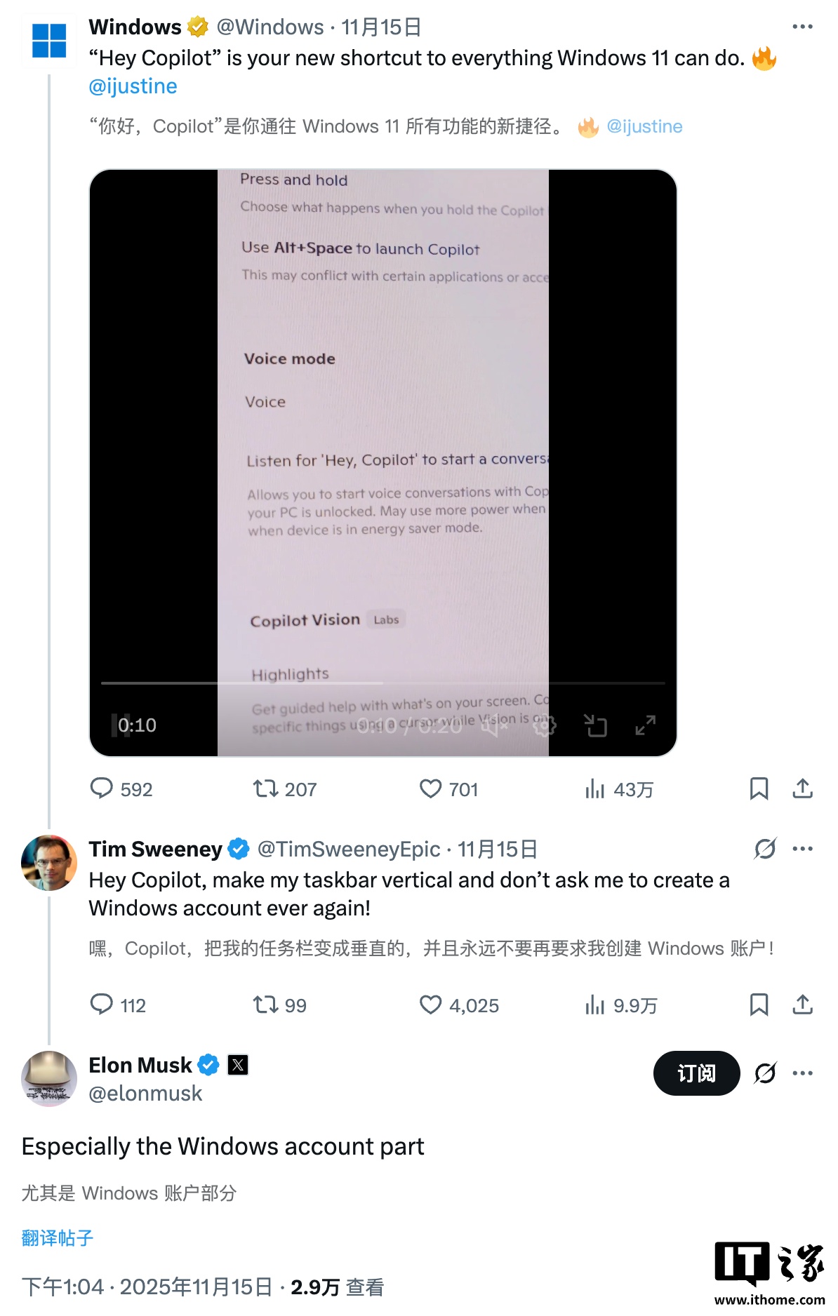 四个半小时后,直言不讳的马斯克回复了蒂姆・斯威尼的评论:“尤其是关于 Windows 账户那部分。”