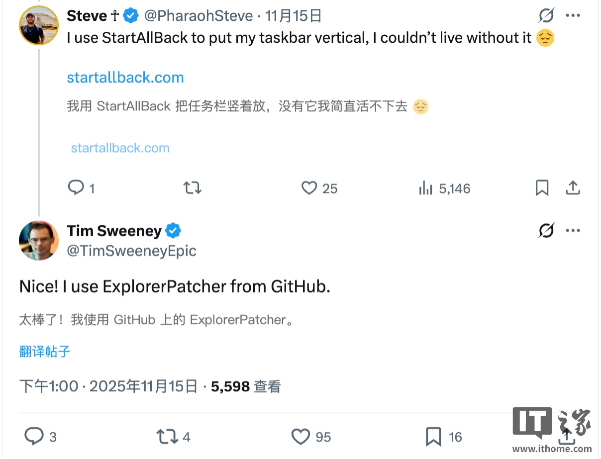 有用户在评论区提到,自己采用“StartAllBack”来“曲线救国”,斯威尼则表示,自己常用的工具是 GitHub 上的 ExplorerPatcher。