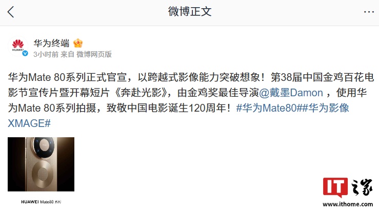alixixi 11 月 17 日消息,华为终端官方于 11 月 11 日在微博分享了第 38 届中国金鸡百花电影节宣传片暨开幕短片 ——《奔赴光影》,该片由第 38 届金鸡奖最佳导演 @戴墨Damon 执导、采用最新华为手机拍摄。