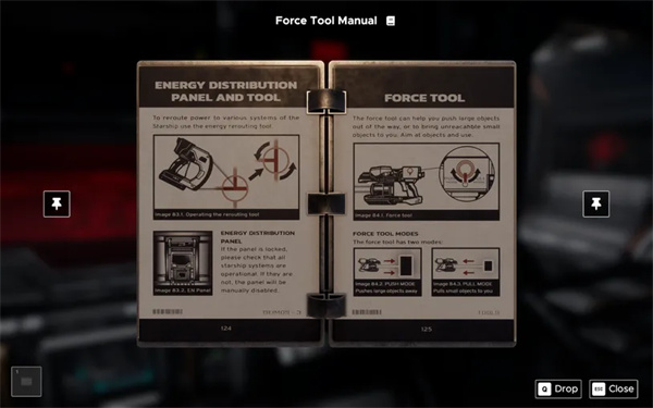 墙上附近有一本工具手册,教你如何使用它。房间周围有几个上锁的区域,标有红色锁和一个数字。数字表示开启锁所需的能量值。