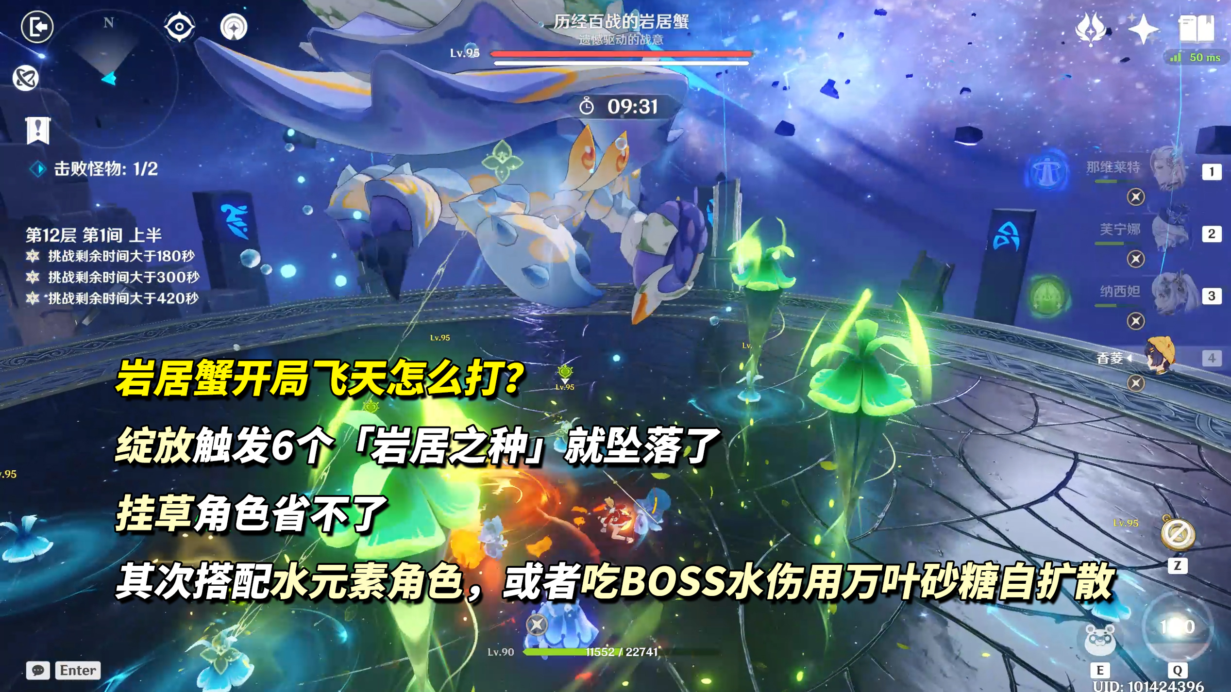 岩居蟹登场会直接飞天开盾,随后在场上留下大量的「岩居之种」,绽放反应激活6个「岩居之种」即可将BOSS破盾打下来,2种策略: