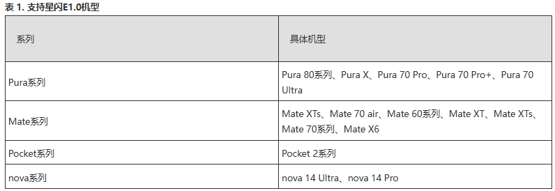 以下表格中的设备所显示的星闪开关,主要用于实现星闪连接功能。星闪连接功能指的是星闪 E1.0,旨在设备间互连互通。星闪 E2.0(星闪音频)需要在星闪 E1.0(星闪连接)的基础上新增提升音质和音频体验的解决方案和协议,需要手机设备芯片能力支持。