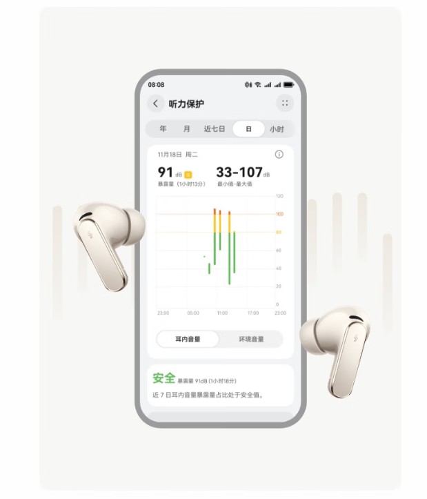 耳机实时监测你的耳内和环境音量,当音量过高或长时间佩戴时,给予提醒。安静环境下完成听力检测后可了解听力损伤状况,还能快速导入自定义听力图数据。基于个性化听力测试数据,开启助听补偿模式,提升人声清晰度,为轻中度听损用户提供听力补偿体验。