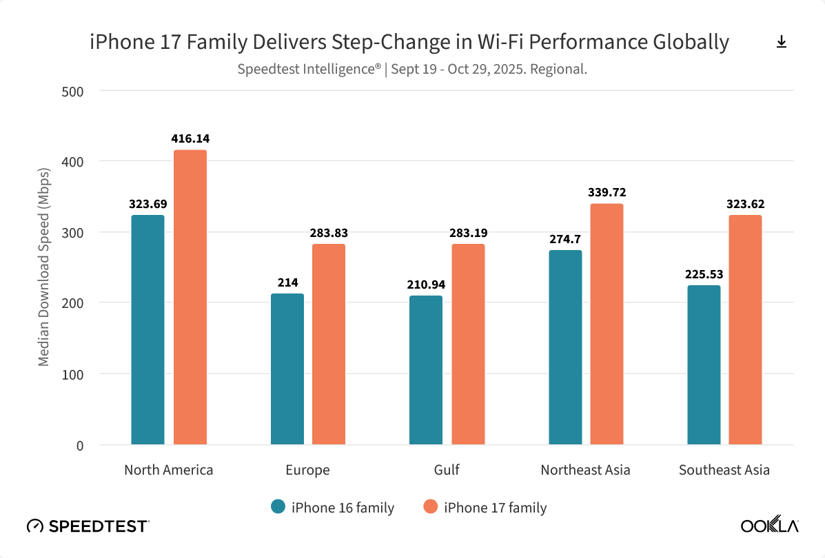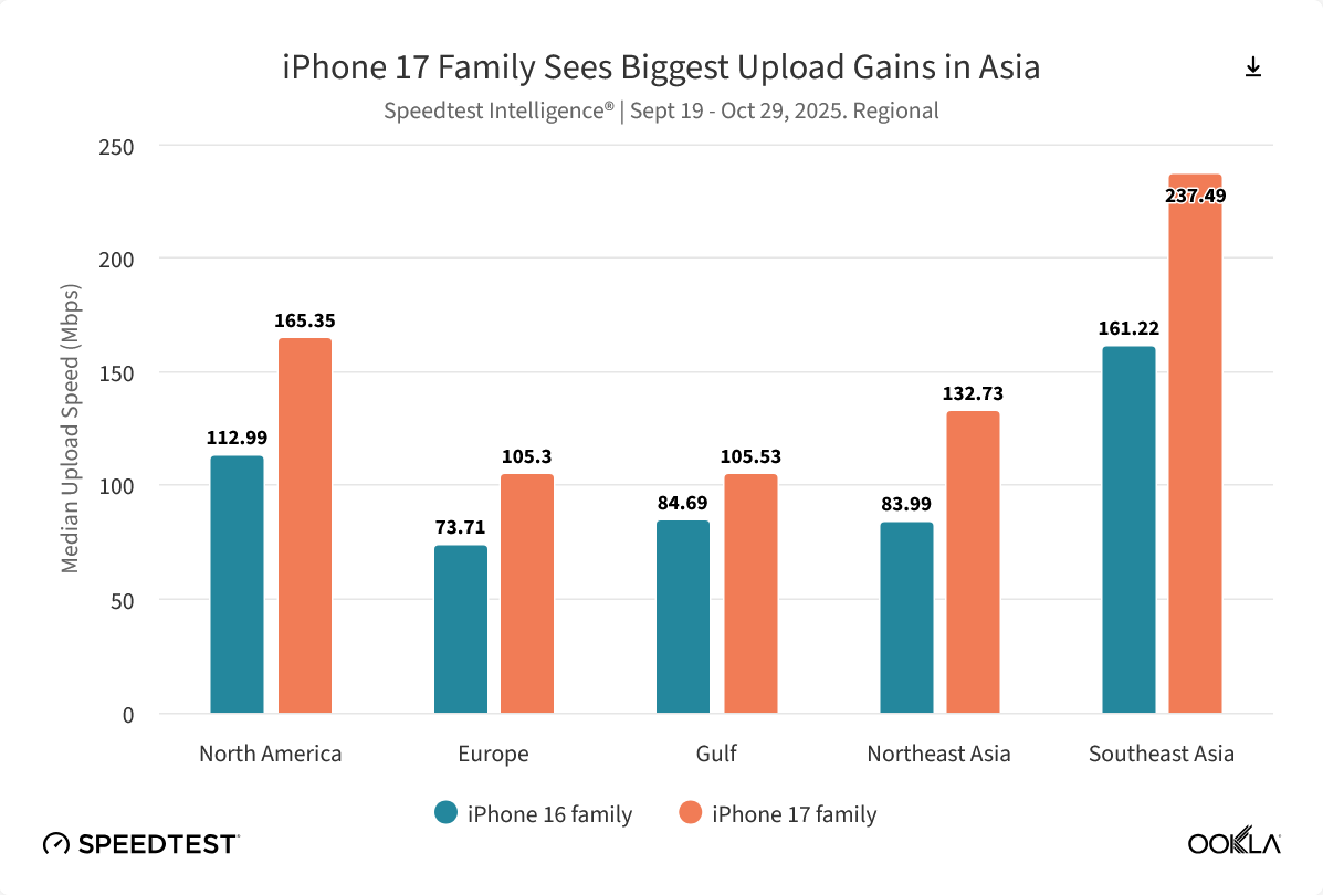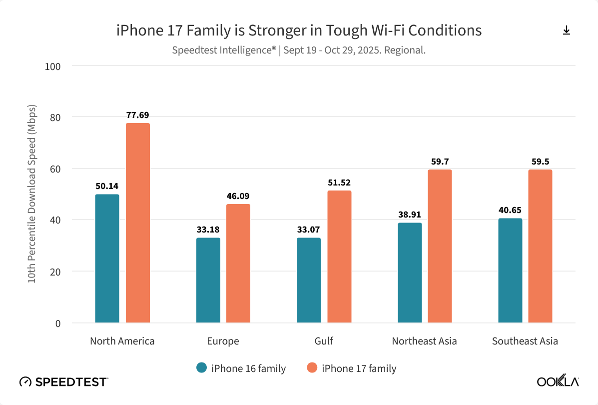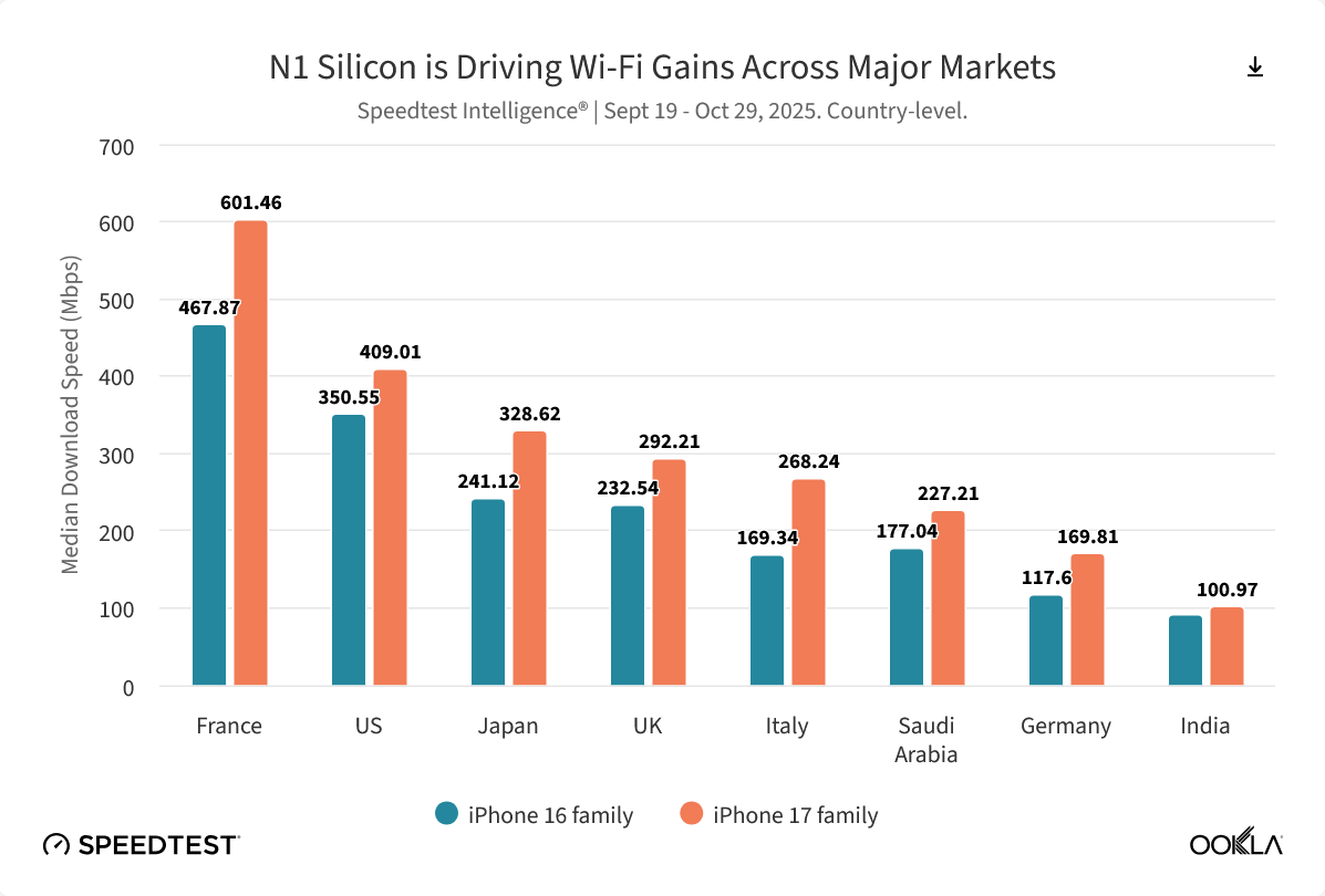 alixixi 11 月 18 日消息,测速机构 Ookla 昨日(11 月 17 日)发布最新《Speedtest Intelligence》报告,指出 2025 年成为 Wi-Fi 技术竞争的关键年份,苹果公司正式在 iPhone 17 系列中推出其首款自研无线网络芯片 N1,相比较 iPhone 16 系列,全球上传和下载中位数增幅均达到 40%。