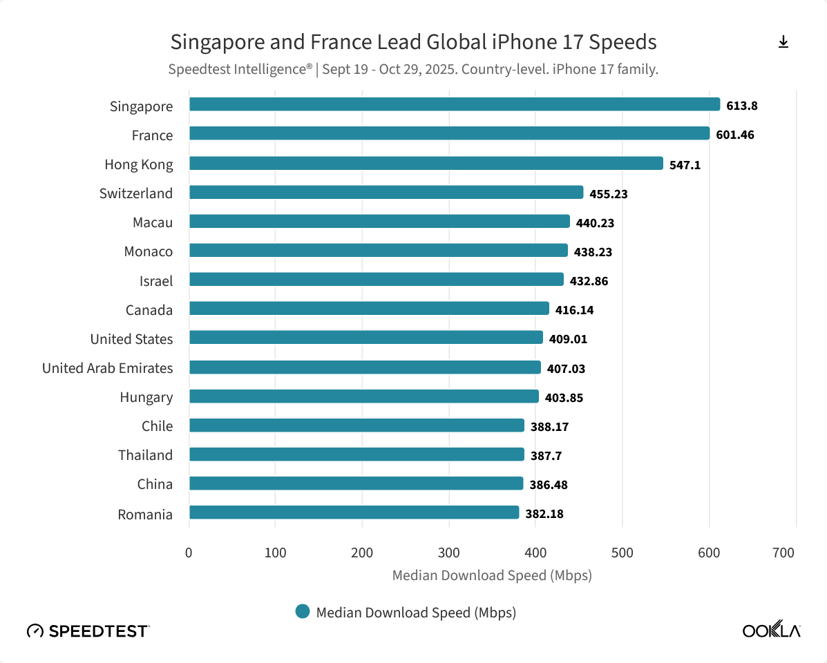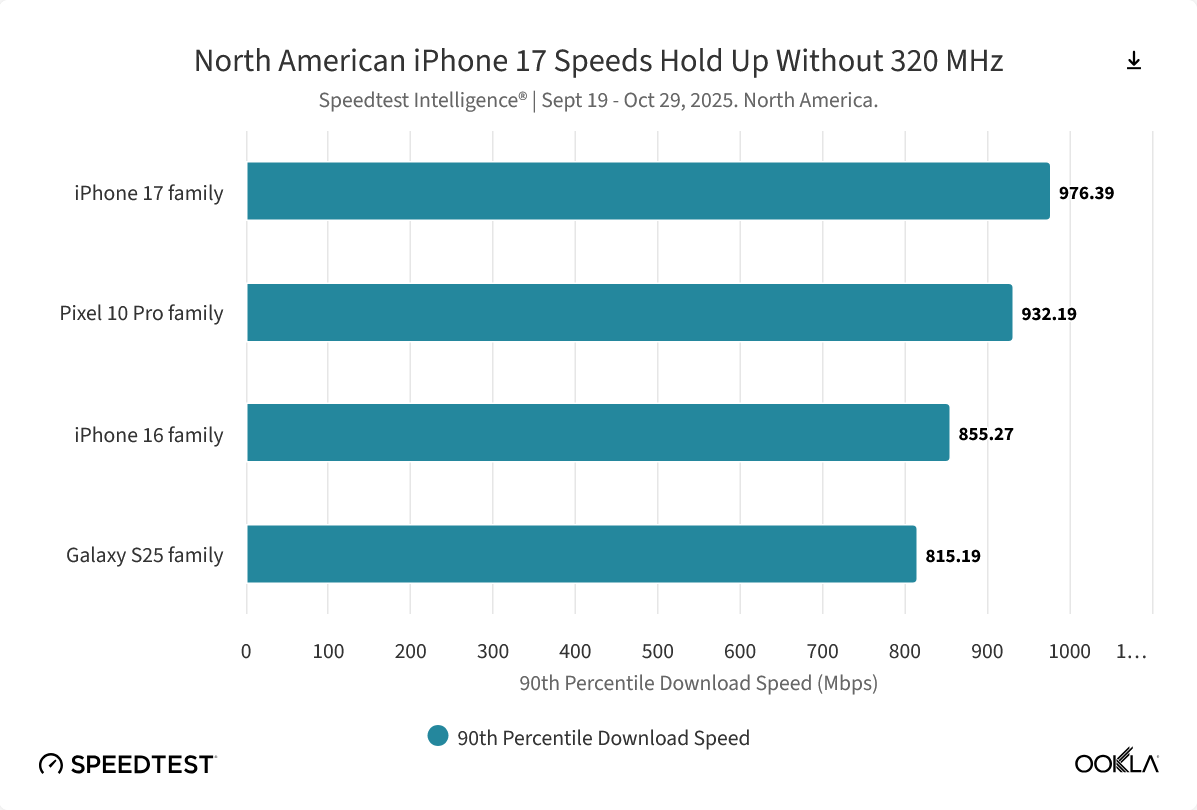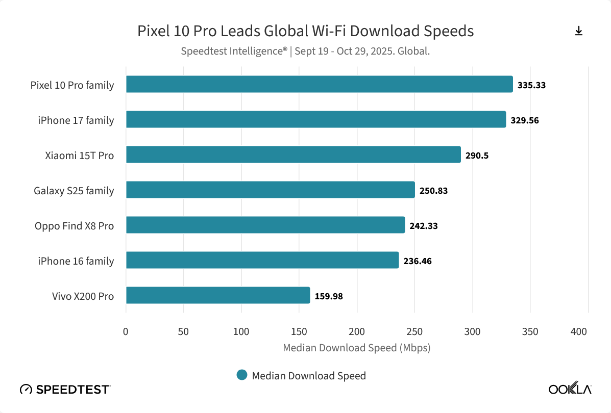 在与安卓旗舰的对决中,苹果并未取得全面领先。谷歌 Pixel 10 Pro 凭借 335.33 Mbps 的全球中位数下载速度,以微弱优势险胜 iPhone 17,成为该项指标的冠军。