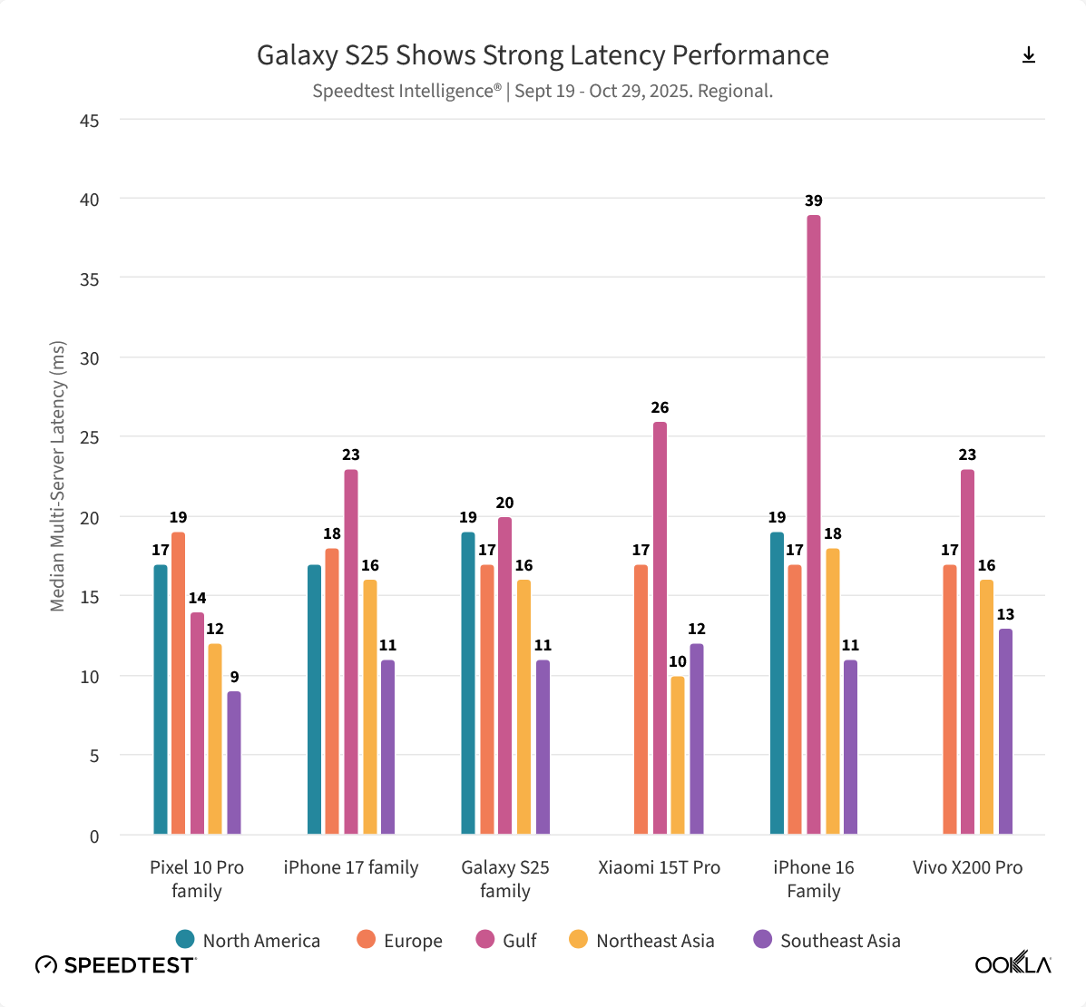 三星 Galaxy S25 系列则在延迟稳定性上表现出色,在北美、欧洲等多个地区创下最低延迟记录。