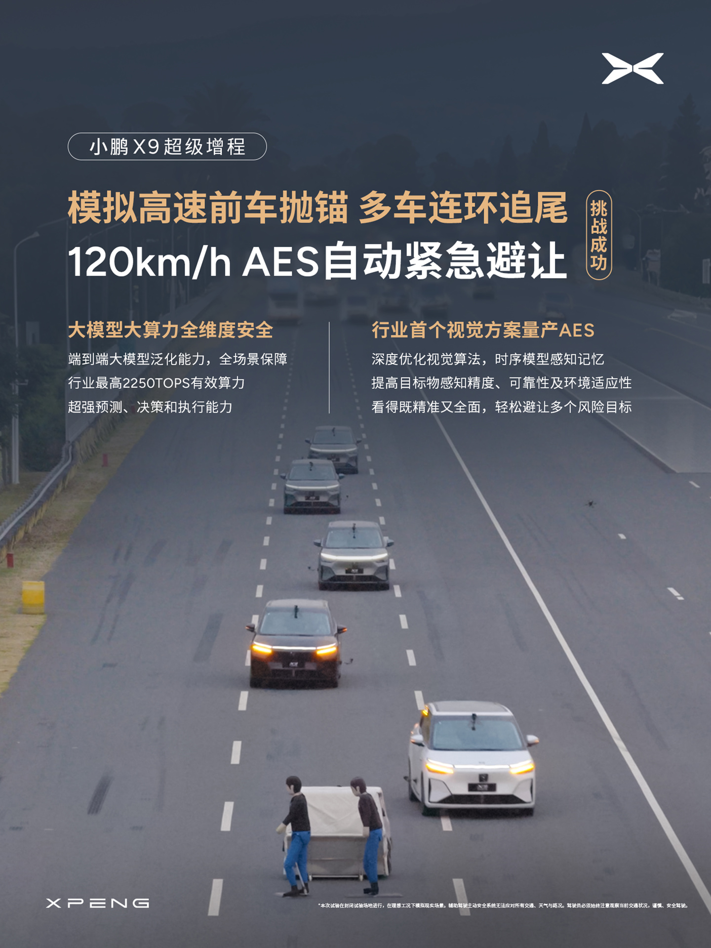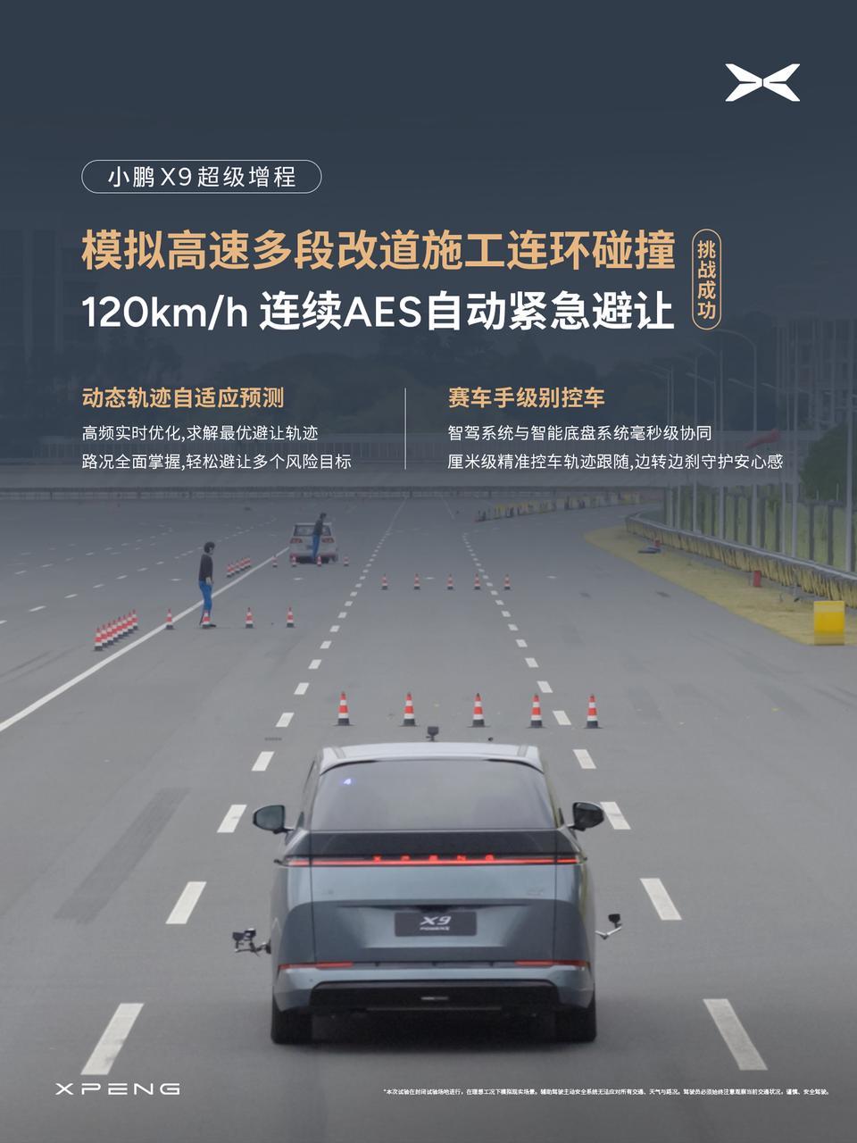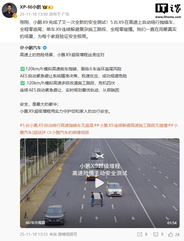 alixixi 11 月 18 日消息,小鹏汽车创始人何小鹏今日宣布,小鹏 X9 超级增程全球首次挑战高速两大高危场景,AES 自动紧急避让全程零失误!