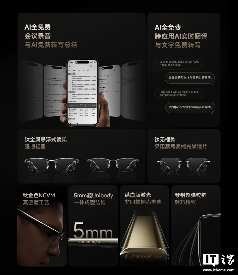 据介绍,界环 AI 音频眼镜特别版“钛无框款”采用无边框设计,购机赠配蔡司高端光学镜片,四款可选;“钛眉框款”选用钛金属,可贴合眉骨;“钛半框款”号称采用高端奢品同级工艺,拥有流畅自然的曲线。新款眼镜采用钛金色 NCVM 纳米级真空镀膜,并辅以前腿一体式设计,镜腿细至 5mm。