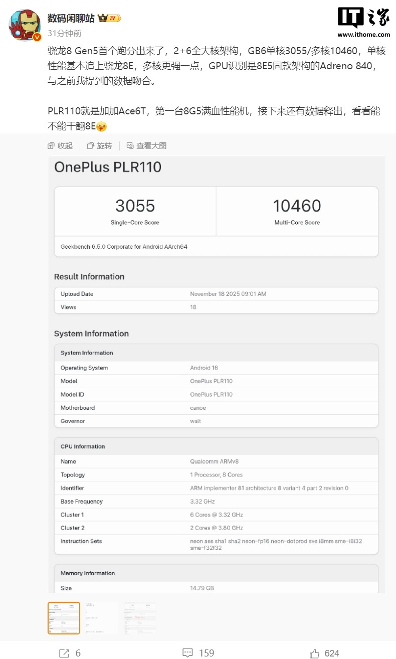 从曝光的跑分来看,第五代骁龙 8 首个跑分单核 3055、多核 10460,单核基本追上骁龙 8 至尊版(3161),多核超越骁龙 8 至尊版(9773),GPU 识别是第五代骁龙 8 至尊版同款架构的 Adreno 840。