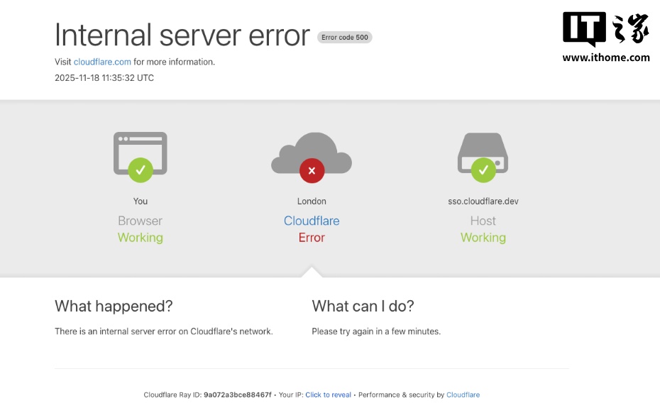 11 月 19 日消息,Cloudflare 是一家提供关键互联网基础设施服务的公司,昨晚突发全球故障,包括社交平台 X(原 Twitter)和 OpenAI 的 ChatGPT 在内的多个网站用户均出现服务问题,被小伙伴调侃:上次 Amazon 挂壁带走了半个互联网,这次 Cloudflare 带走了剩下半个。