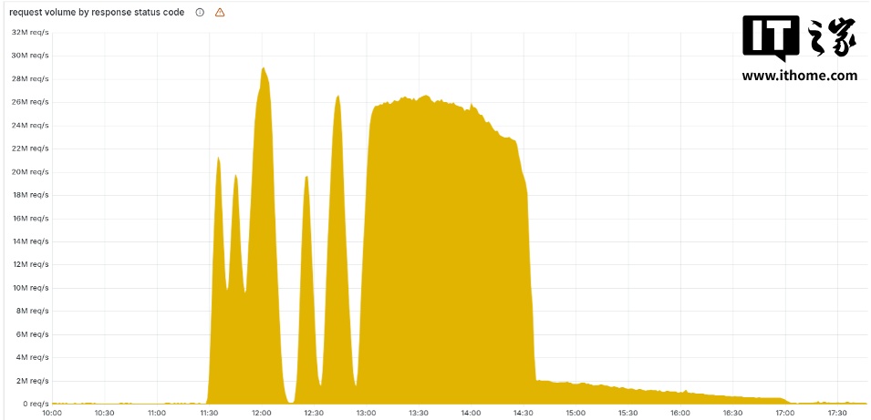 下图展示了 Cloudflare 网络提供的 5xx 错误 HTTP 状态代码的数量。正常情况下,这个数值应该非常低,并且在停机开始之前也是如此。