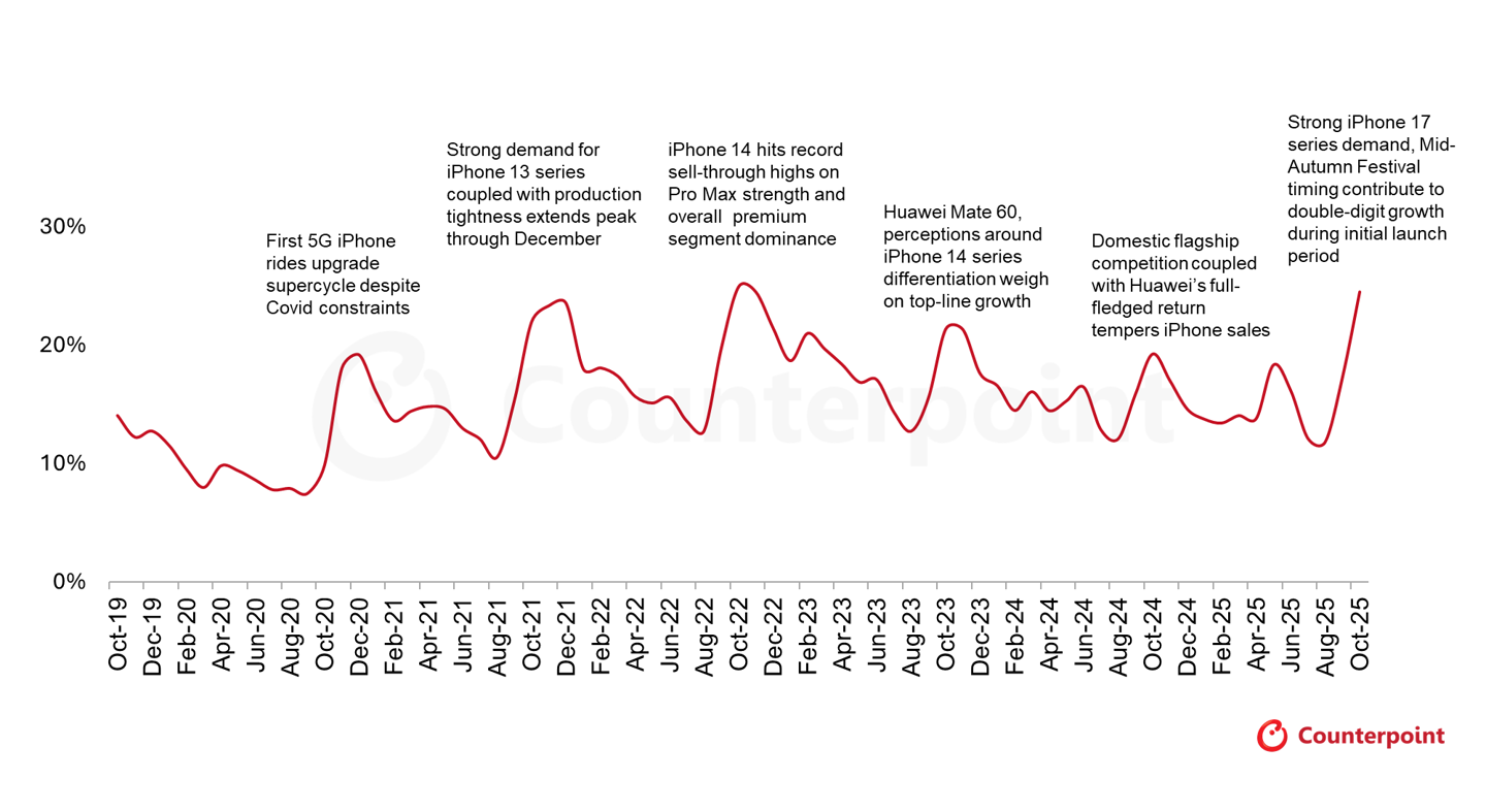 10 月份在中国售出的智能手机中,每四部就有一部是 iPhone,这一里程碑式的成就此前仅在 2022 年达到过一次,而当时苹果在高端市场的竞争对手较少。