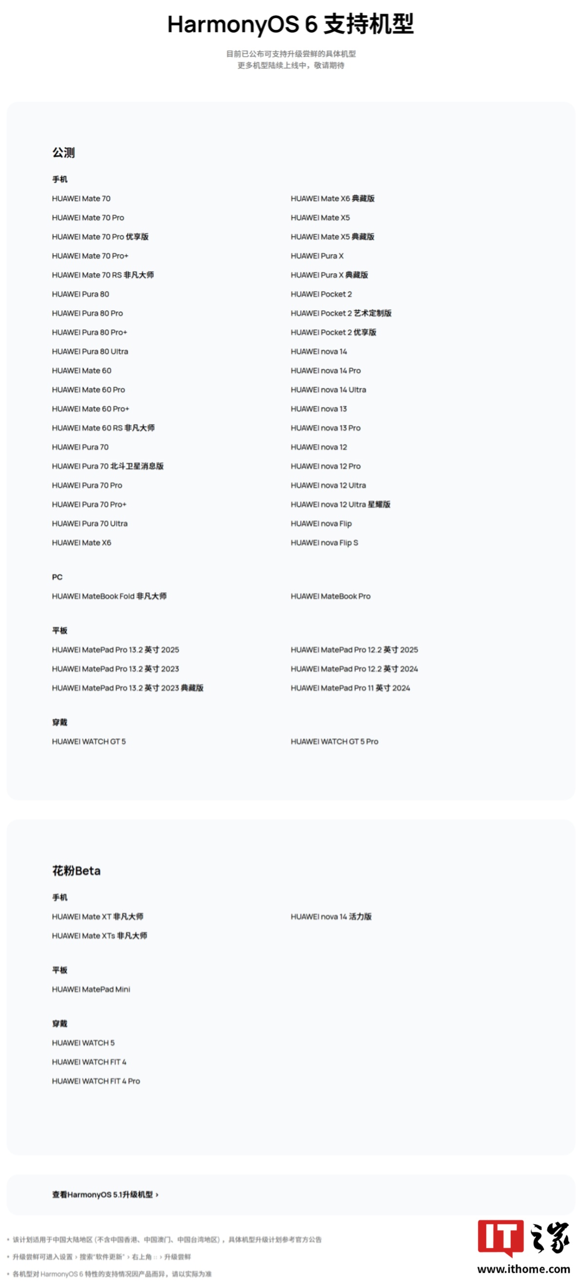 alixixi注意到,华为官网已更新 HarmonyOS 6 支持机型情况:MatePad Pro 12.2 英寸 2025 款平板、WATCH GT 5 系列手表等开放了鸿蒙 6 系统的公测升级;nova 14 活力版手机、MatePad Mini 小平板、WATCH FIT 4 系列手表开启了花粉 Beta 版本尝鲜升级。具体如下: