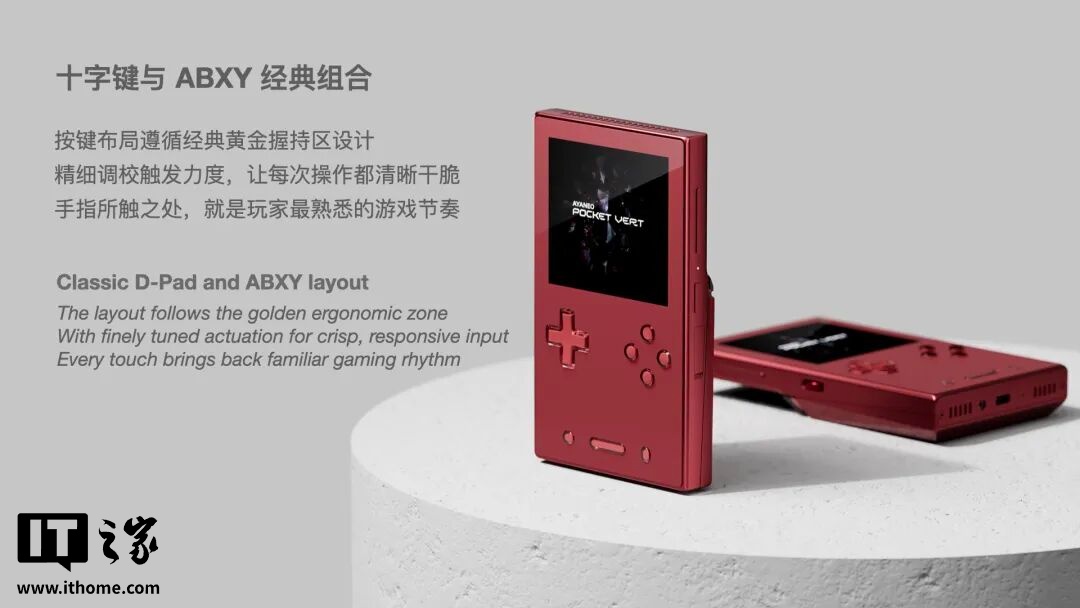 Pocket VERT 掌机提供耀夜黑、月华白、熔岩红三款配色,采用全局无刻按键设计,同时所有按键均为无刻设计。掌机的按键材质则为水晶质感,并延续竖版掌机黄金握持区的经典十字键 + ABXY 布局,SE、ST 以及 AYA 键也采用简洁直观设计。