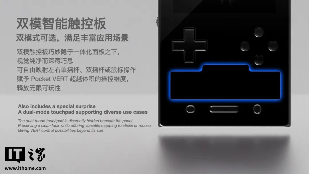AYANEO Pocket VERT 竖版复古掌机配备 MagicSwitch 键,支持长按呼出功能菜单;加入了双模智能触控板(隐藏于一体化面板下),支持自由映射左右单摇杆、双摇杆或鼠标模式。Pocket VERT 还搭载 6000mAh 电池,其肩键采用钻石切割设计。