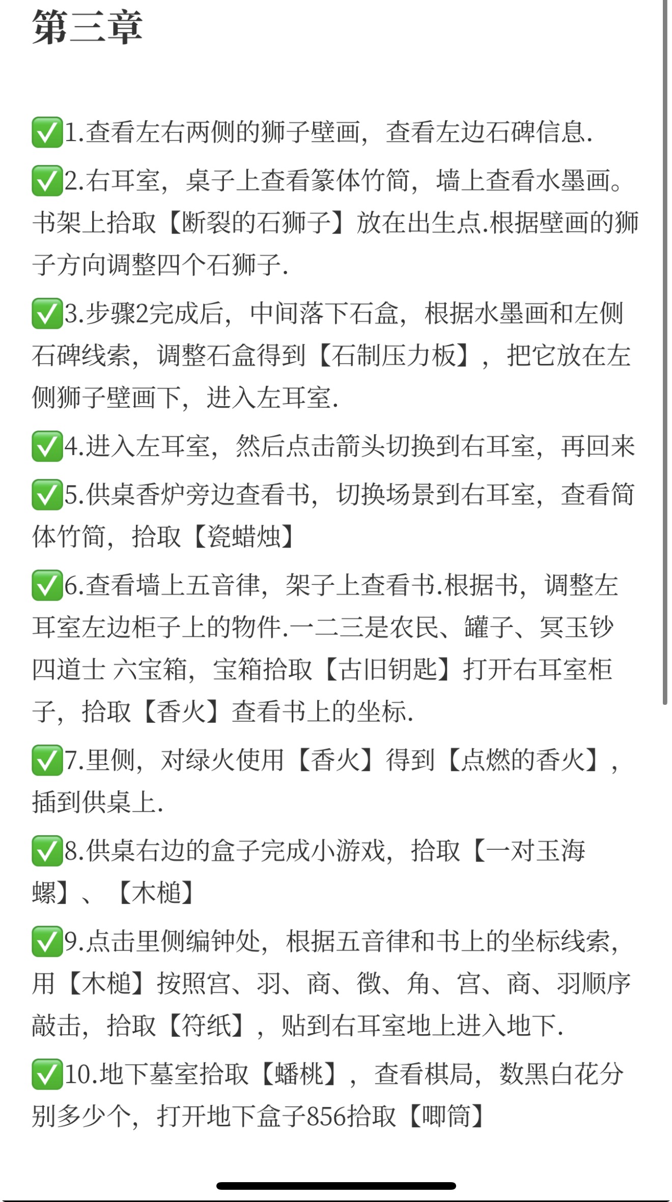 《缠重山2冥玉钞》第三章通关攻略:第三章需破解多处机关谜题。首先调整石狮子方向开启石盒,获取压力板进入左耳室。关键步骤包括:按五音律顺序敲击编钟;在地下墓室根据棋局数字856解开机关;最后依据动物特性正确摆放五个灵牌,并使用指魂灯引导鬼火,即可通关。