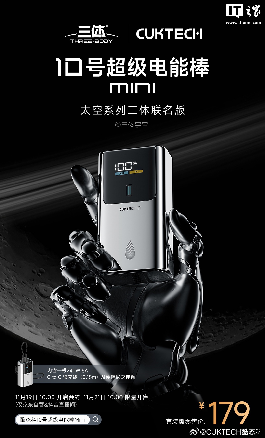 酷态科 10 号超级电能棒 Mini 于今年 3 月发布,自带一根 C2C 数据线,官方售价 159 元。太空系列三体联名版印有水滴图案。