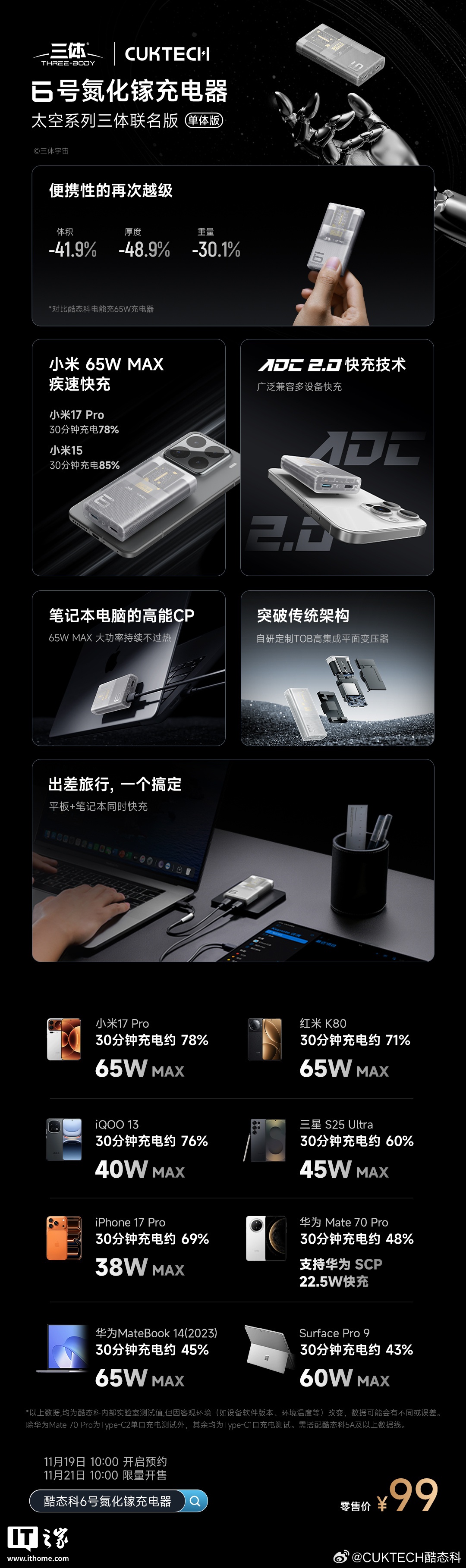 6 号氮化镓充电器「太空系列三体联名版」,零售价 99 元
