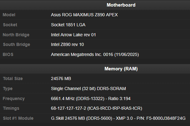 德国超频玩家“CENS”本次使用的配置为英特尔酷睿 Ultra 9 285K 处理器、华硕 ROG Maximus Z890 APEX 主板以及 G.Skill Trident Z5 24GB DDR5 内存条。