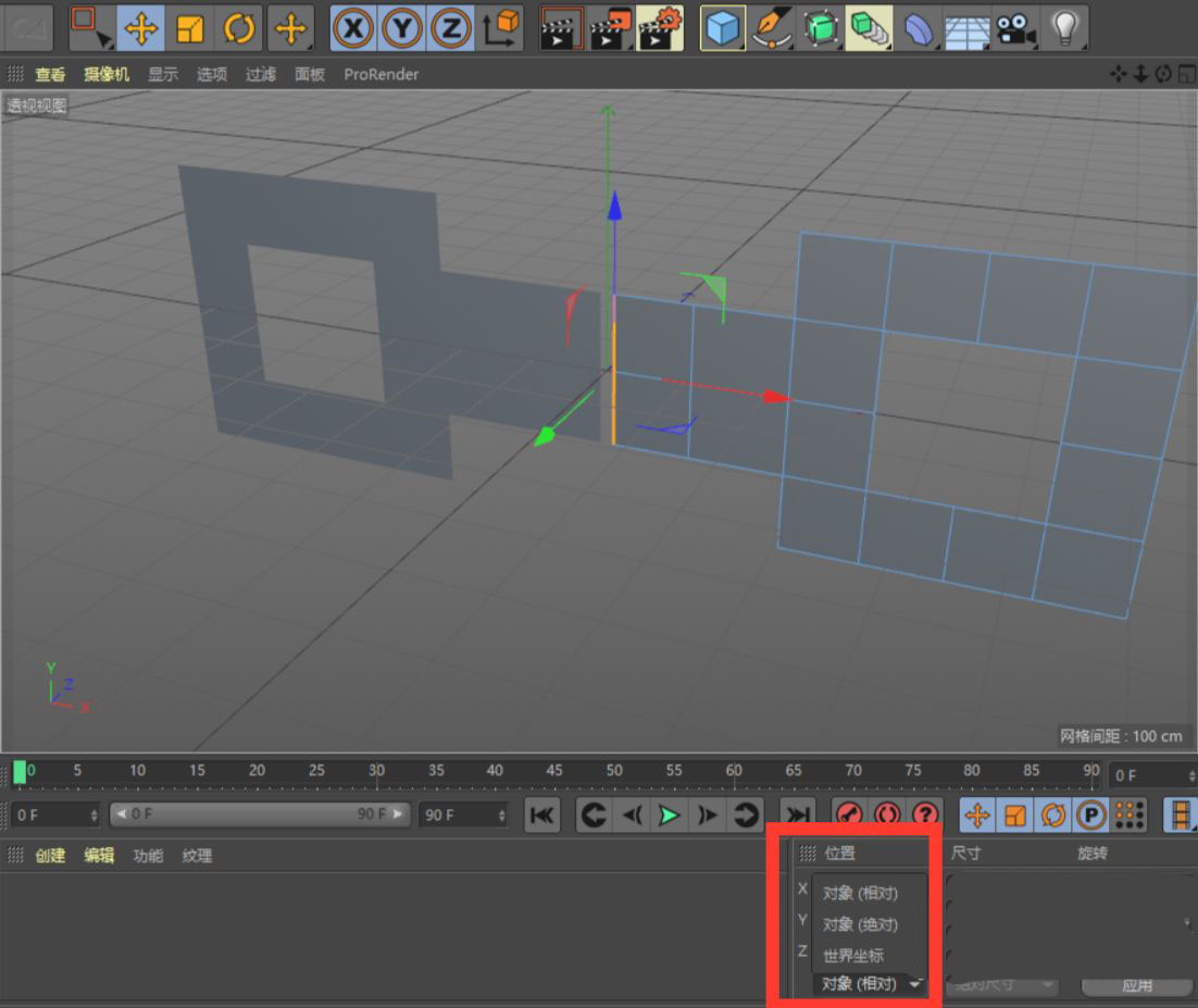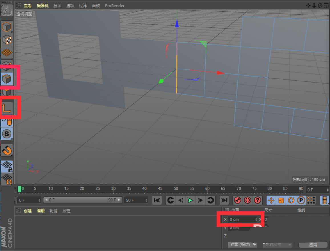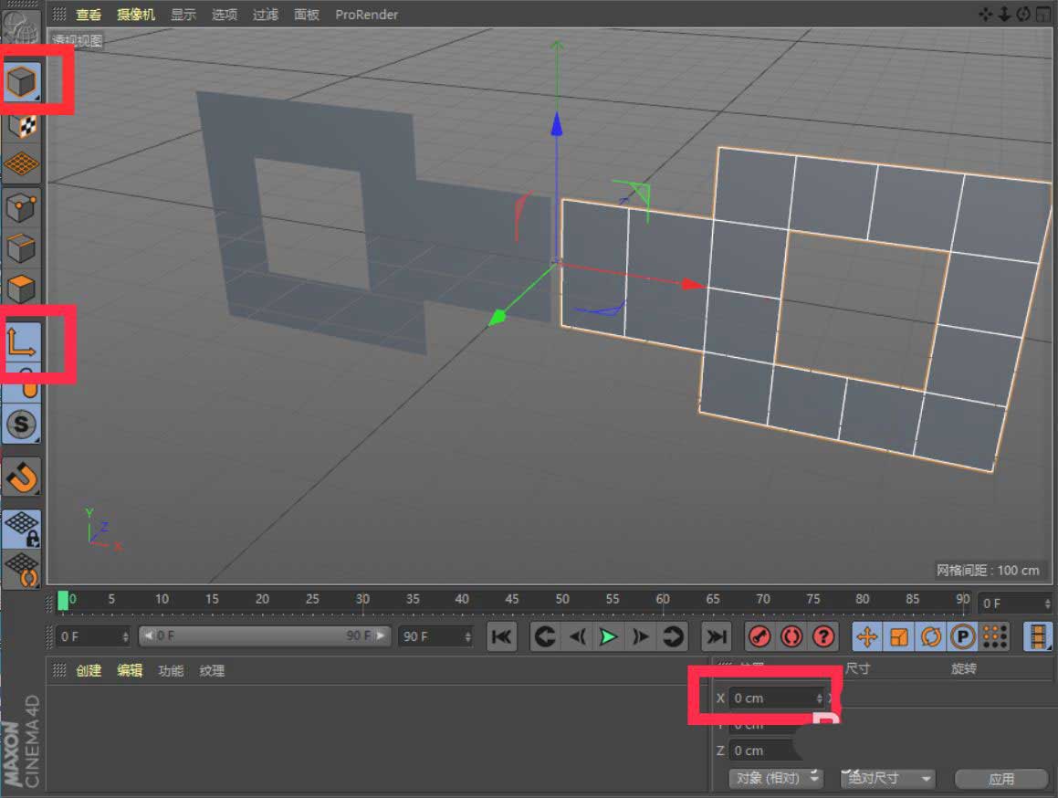 然后选中平面,切换到模型模式,并启用轴心,在坐标面板将轴心的位置的X坐标改为0,点击应用。