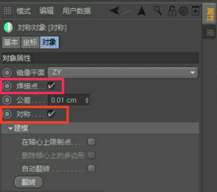 (2)在对称效果的属性页面勾选对称与焊接点,保证能正确焊接对称面与编辑面