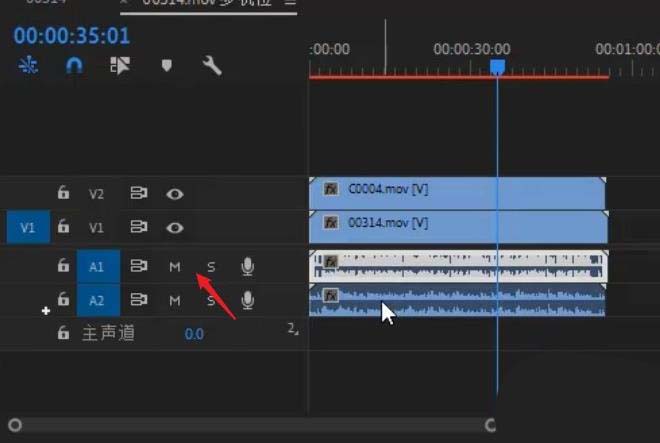 8、双击下面的音频轨道,进行音频编辑把其他机位的声音都静音,只留一个机位的声音就可以了。记得先要解锁音频与视频的连接。