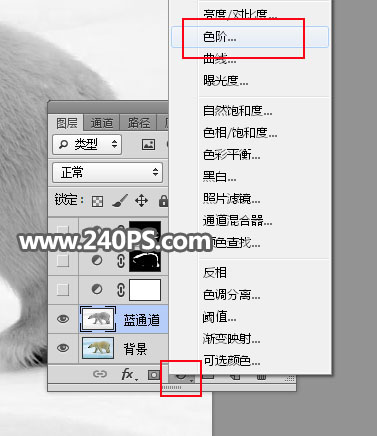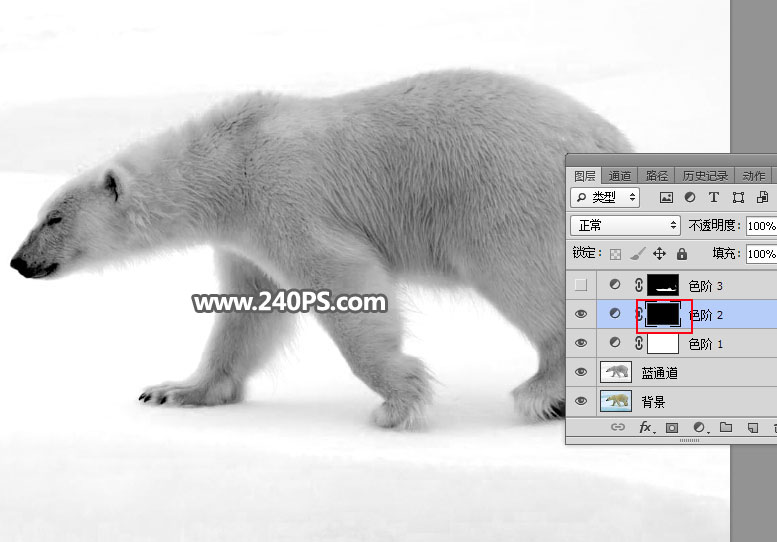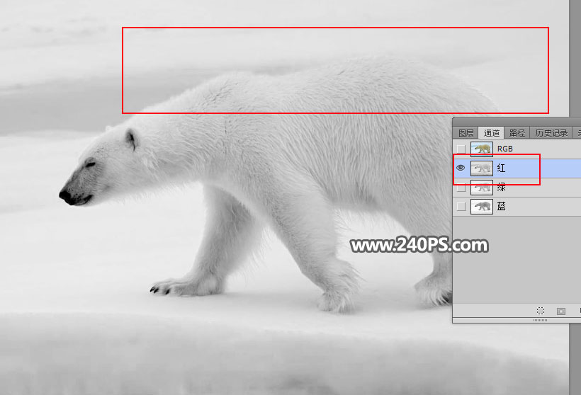 选择红通道:北极熊顶部的毛发与背景基本一致,不太理想。