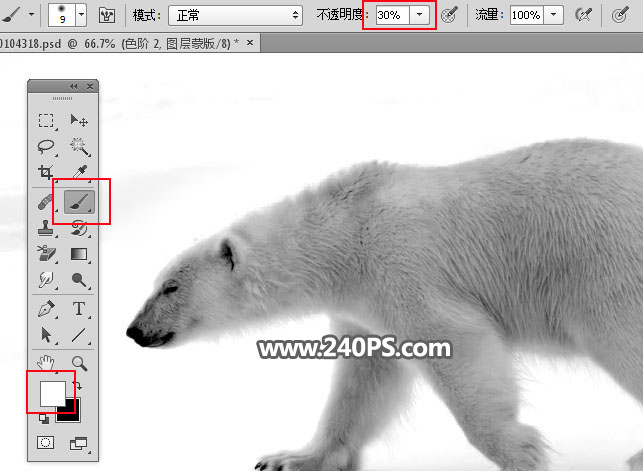 6、选择画笔工具,不透明度设置为30%,同时把前景色设置为白色。