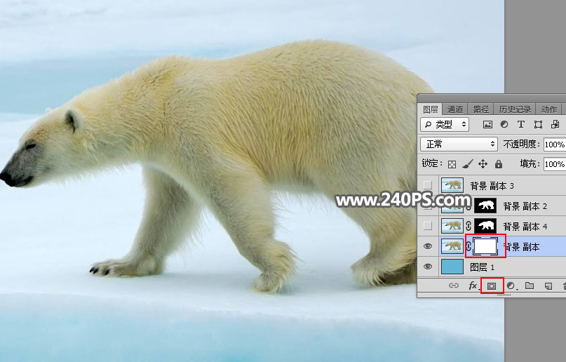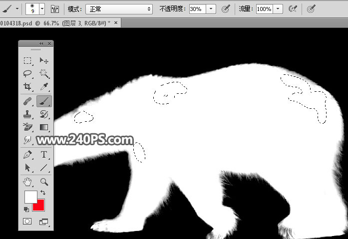 17、新建一个空白图层,把前景色设置为白色,然后用柔边画笔把北极熊身体区域偏灰的部分涂白。