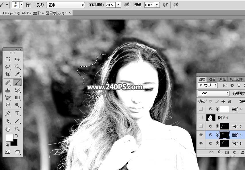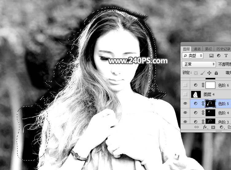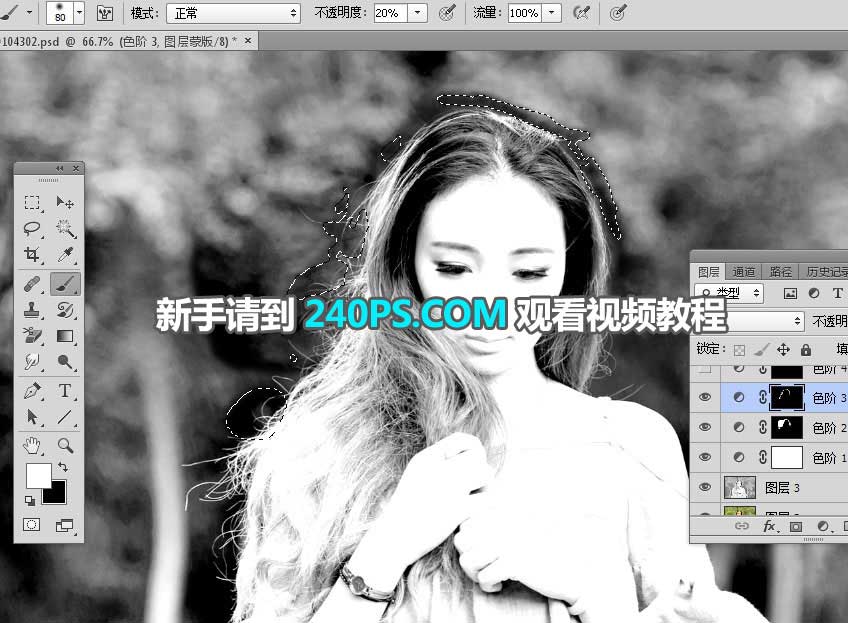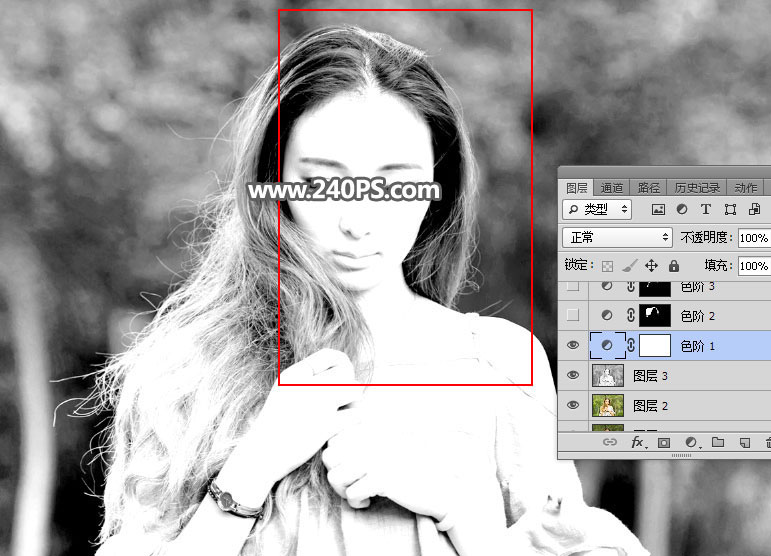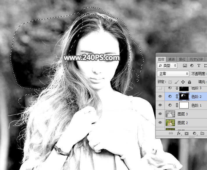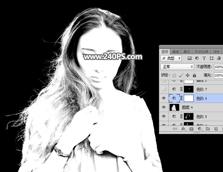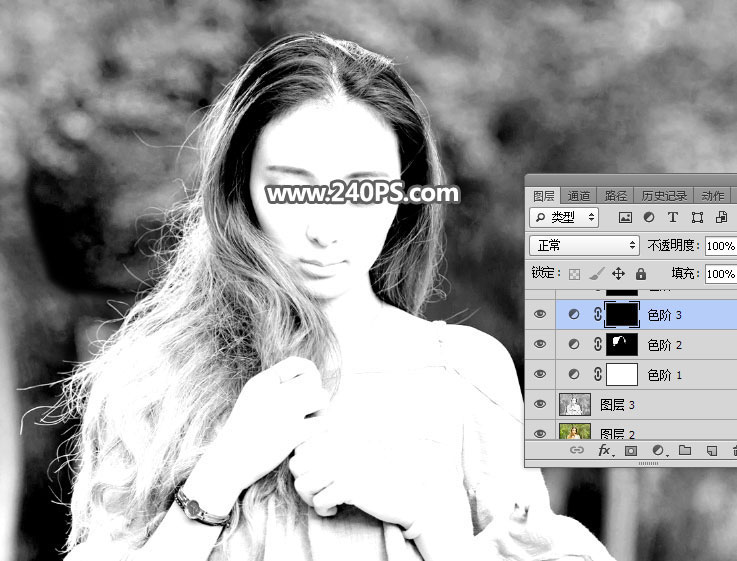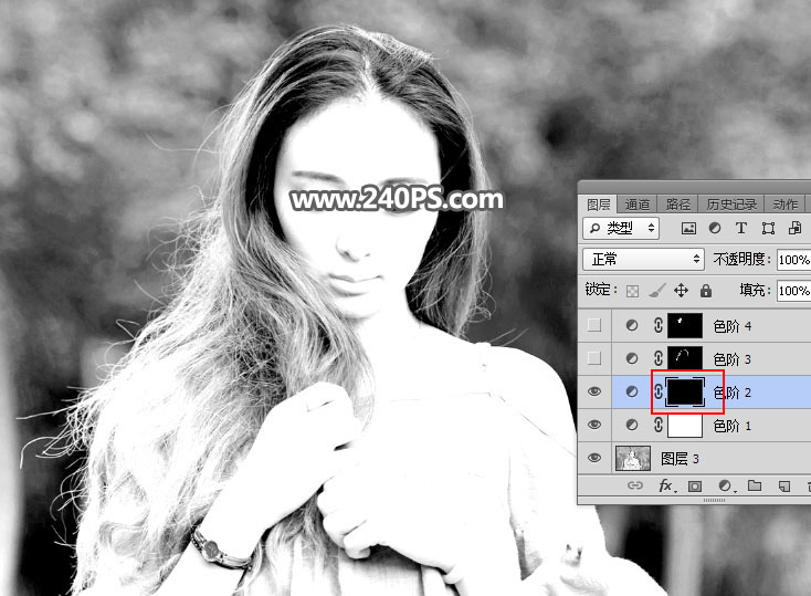 10、发丝受光不是很均匀,局部需要单独调整。创建色阶调整图层,参数设置如下图,确定后把蒙版填充黑色。