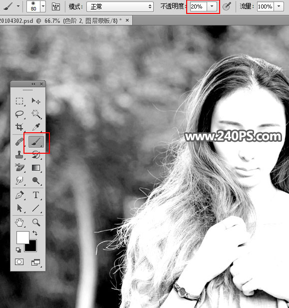 11、把前景色设置为白色,选择画笔工具,画笔不透明度设置为20%,如下图,后面用到的画笔设置参数不变。