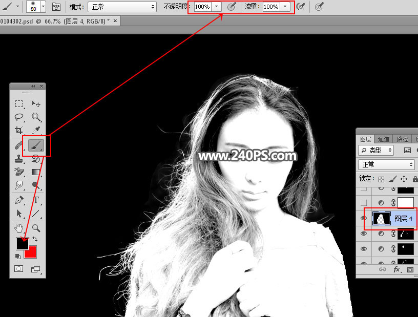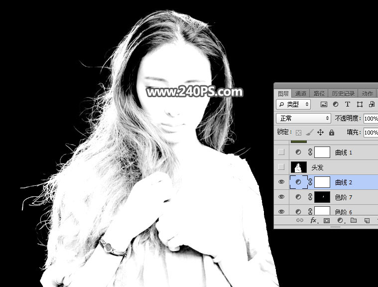 19、新建一个空白图层,把前景色设置为黑色,选择画笔工具,画笔不透明度为100%,然后用画笔把头发以外的区域涂黑,如下图。