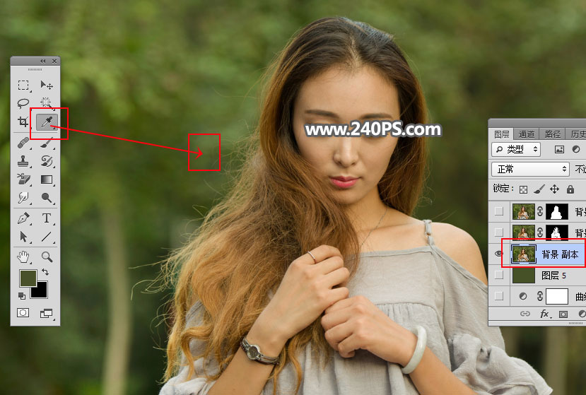 23、把背景图层复制一层,得到背景副本图层,按Ctrl + Shift + ] 置顶;选择吸管工具,然后吸取下图红框位置的颜色。